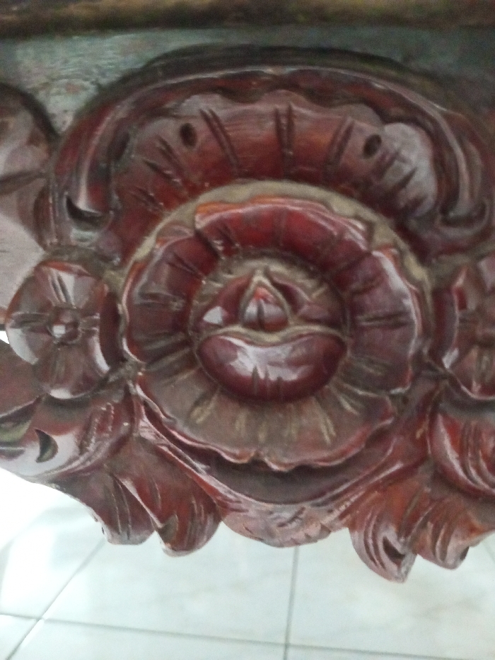 A close-up shot presents an ornately carved wooden object, likely a furniture detail. The central focus is a stylized rose, composed of layered petals encircling a tightly wound bud. Smaller, similar floral designs flank the central rose. The wood is stained a rich, dark red-brown, exhibiting a glossy sheen. The carving shows distinct depth and texture, emphasizing the organic curves of the floral motifs. The background includes a glimpse of a white tiled surface.
