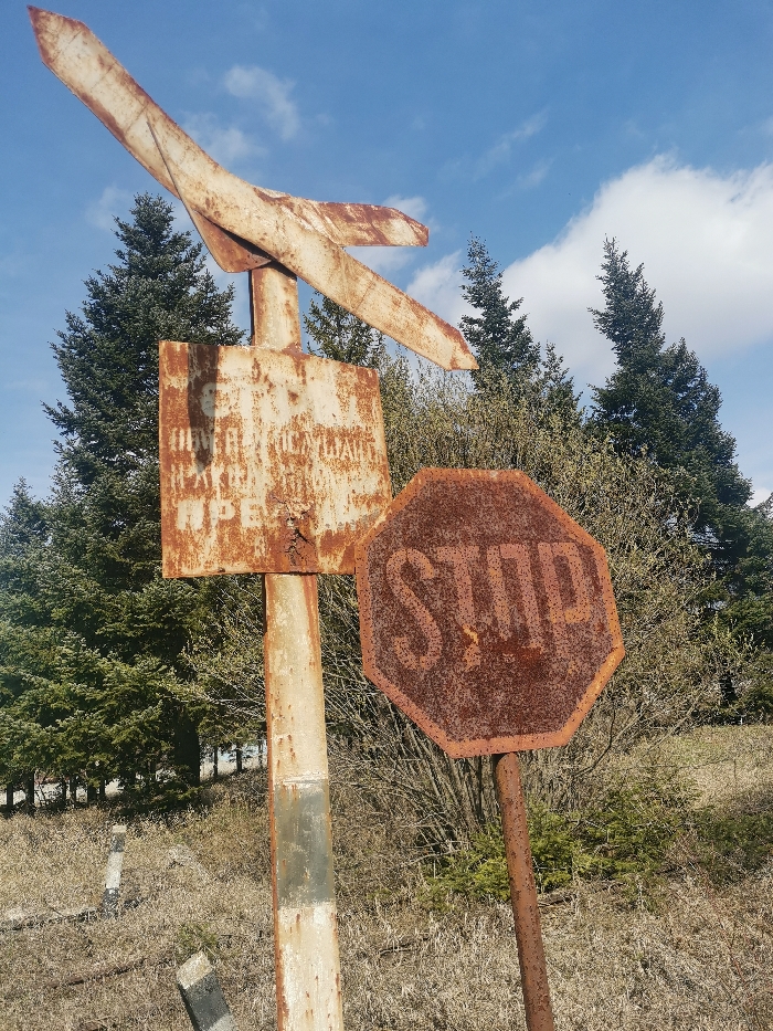 - "The scene, situated in Verinsko, Bulgaria, depicts two heavily corroded metal signs in an outdoor, vegetated environment under a partially cloudy blue sky" by FM-eXNrv1, licensed under CC BY 4.0