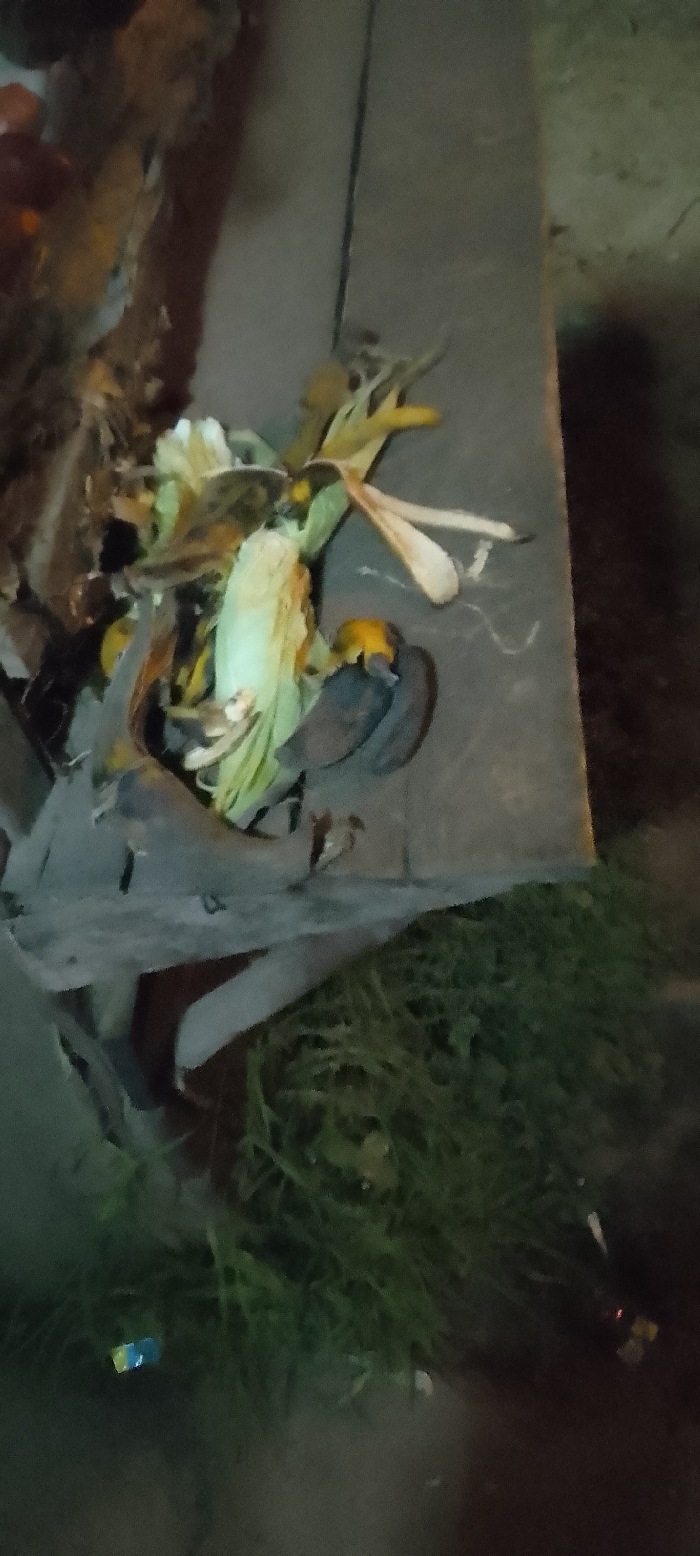 A pile of corn husks, including some corn, sits on a gray concrete ledge next to a patch of green grass. The scene is dimly lit, suggesting it's taken at night. Some wooden debris is visible near the corn, and a small piece of trash is discernible within the grass. The overall impression is of discarded organic matter near a roadside or urban edge.
