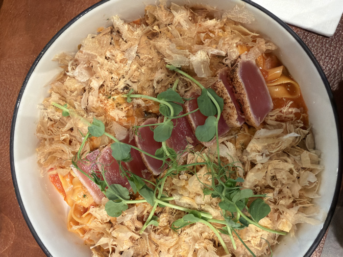 The image presents a top-down view of a meal served in a white ceramic bowl with a dark rim. The dish consists of broad, flat pasta, possibly tagliatelle, coated in a creamy red-orange sauce. Five slices of seared tuna, exhibiting a pinkish-red interior and a lightly browned, textured exterior, are arranged across the pasta. A generous quantity of light brown, thin, and curled flakes, consistent with bonito flakes (katsuobushi), covers a significant portion of the dish. A sprig of vibrant green microgreens or sprouts is placed centrally over the tuna and flakes, serving as a garnish. The bowl rests on a textured, brown surface, possibly leather or a similar material. The specific location within the city of Dub, Montenegro, cannot be determined from the visual information provided in this image.