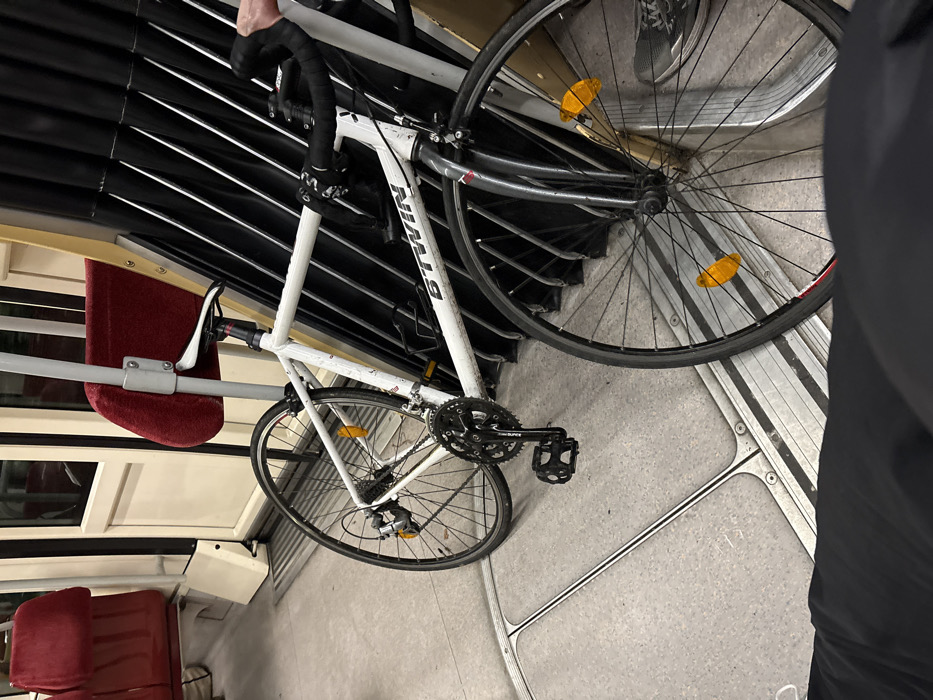 - "A white "Btwin" road bike with black accents is tilted at an angle inside what appears to be public transportation" by FM-Az2kA2, licensed under CC BY 4.0