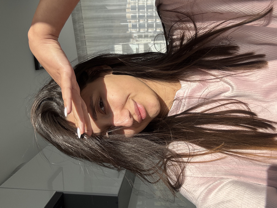 A female individual is depicted indoors, framed from the chest up. She has long, dark brown hair that partially covers her face. Her left hand is raised horizontally, with fingers slightly spread, casting a shadow across the upper portion of her face as she shields her eyes from direct sunlight. The fingernails on her left hand are painted white with black tips. She is looking towards the viewer with a slight smile. A small, dark earbud is visible in her right ear. She wears a light pink, ribbed, long-sleeved garment, featuring a subtle embroidered sun and moon design on the left chest area. The background on the left consists of white, flat-panel cabinetry and a dark rectangular appliance. To the right, a window with sheer white curtains reveals indistinct outlines of multi-story urban buildings. The scene is illuminated by strong natural sunlight, creating high contrast. The specific location within the city of Budva, Montenegro, cannot be determined from the visual information presented.