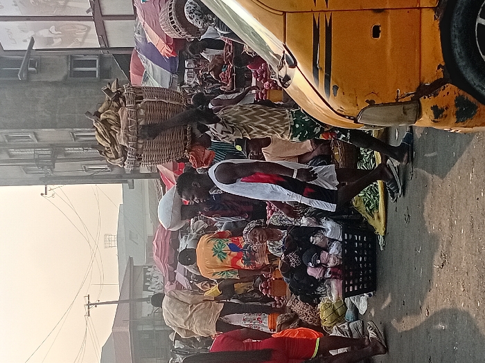 A bustling street market scene is shown. People are densely packed, selling goods such as plantains carried in baskets on their heads. A yellow vehicle is visible on the right. The air appears hazy. Electrical poles and buildings are in the background. Many vendors are bending to display items laid out on the ground, creating a crowded and busy atmosphere.