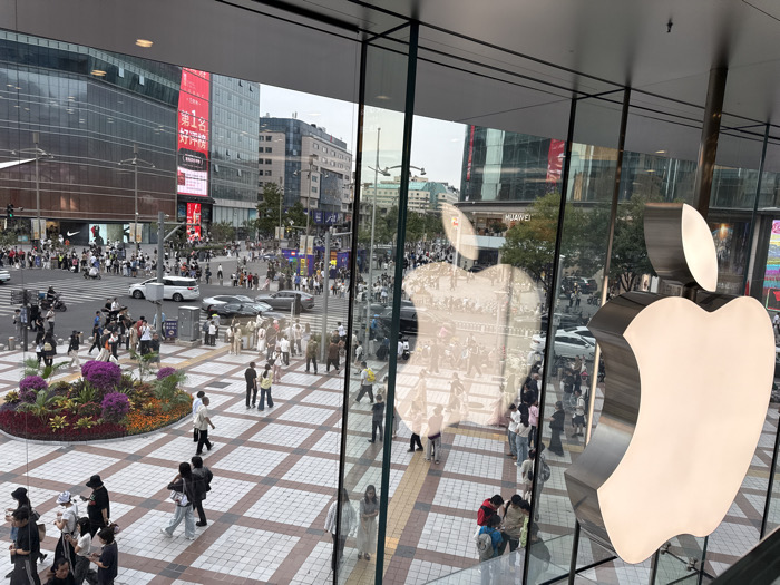 The image captures an elevated view from inside a building with a large glass facade, looking out onto a bustling urban intersection in the Wangfujing area of Dongcheng District, Beijing, China. In the immediate foreground, a prominent, illuminated three-dimensional Apple logo is visible, partially reflecting the exterior scene. Outside, a wide pedestrian plaza features light and dark checkered tiles, leading to marked crosswalks. A central oval planter filled with purple and yellow flowers occupies the plaza. Numerous pedestrians are present on sidewalks and crosswalks, actively walking or congregating. Multiple vehicles, including a white van and dark-colored sedans, are visible on the street. The background consists of multi-story commercial buildings with extensive glass facades. Prominent signage includes a large red billboard displaying Chinese characters and a distinct Nike logo on a building to the left. Reflections of other buildings and a "HUAWEI" sign are observable on the glass barrier. The sky appears overcast, indicating daylight conditions. The scene depicts a densely populated commercial area with active foot and vehicle traffic.