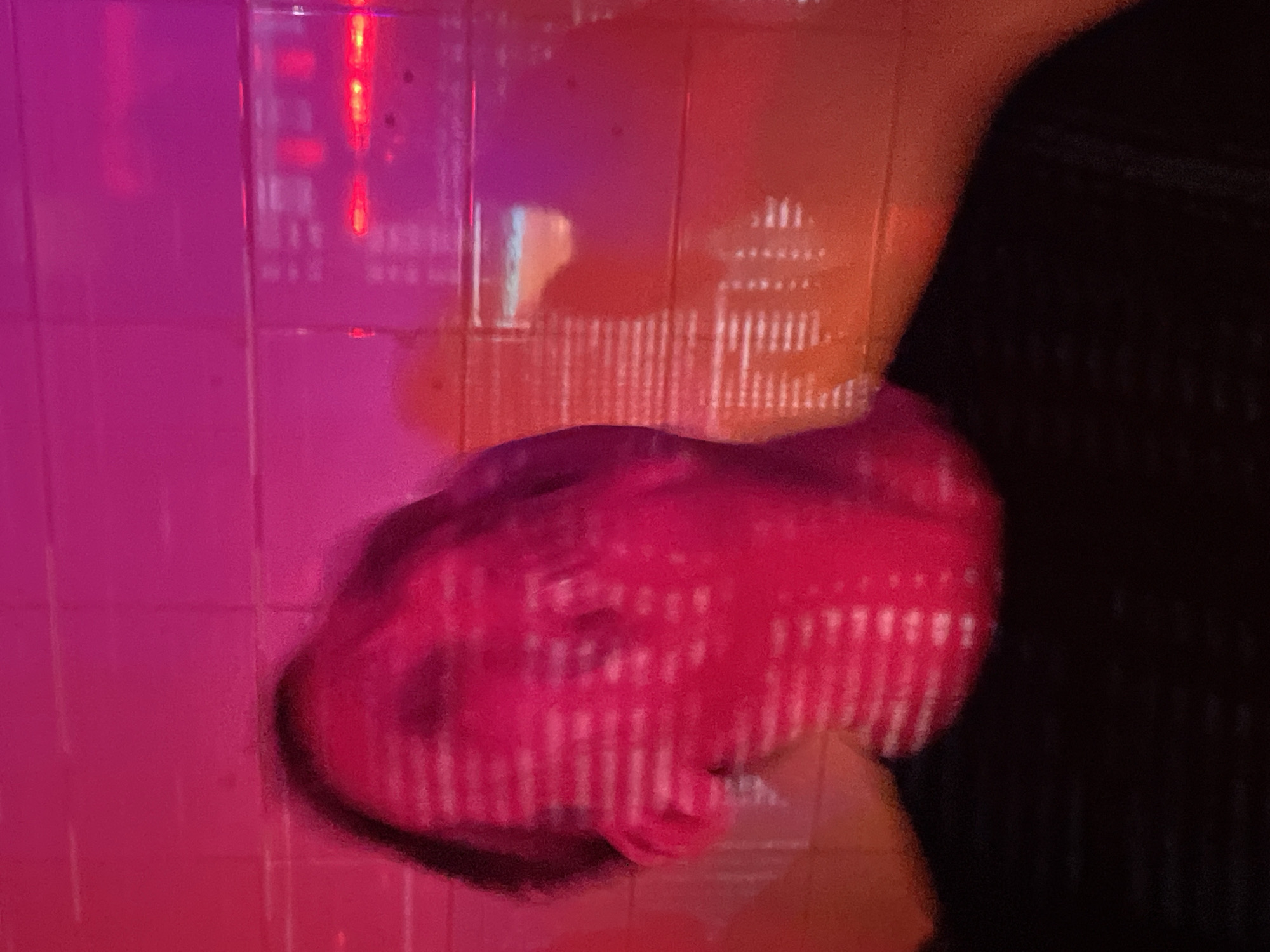 The image captures a male individual positioned centrally, from the chest up, in a low-light indoor environment within Moscow, Russia. The scene is dominated by vibrant red and pink artificial lighting. The subject wears a dark-colored t-shirt. Their face is indistinct due to blur and is overlaid with bright white horizontal line patterns and scattered dots, resembling alphanumeric projections or data streams. These patterns extend onto the tiled background wall, which exhibits horizontal grout lines and shifts in color from deep pink to orange-red. On the right side of the background, a faint, orange-toned shadow of a human-like figure or object is discernible, also patterned with projected lines. In the upper right background, subtle illuminated elements consistent with electronic equipment or indicator lights are present. The subject's head is slightly tilted to the left, and their dark hair is styled away from their face. No active interaction is depicted; the subject appears to be passively illuminated by the projected light.