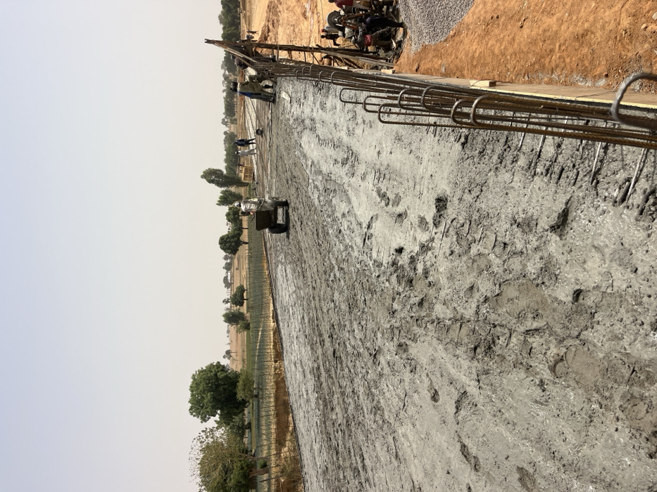 The image depicts an active construction site in Gyellesu, Nigeria, under a clear, bright sky