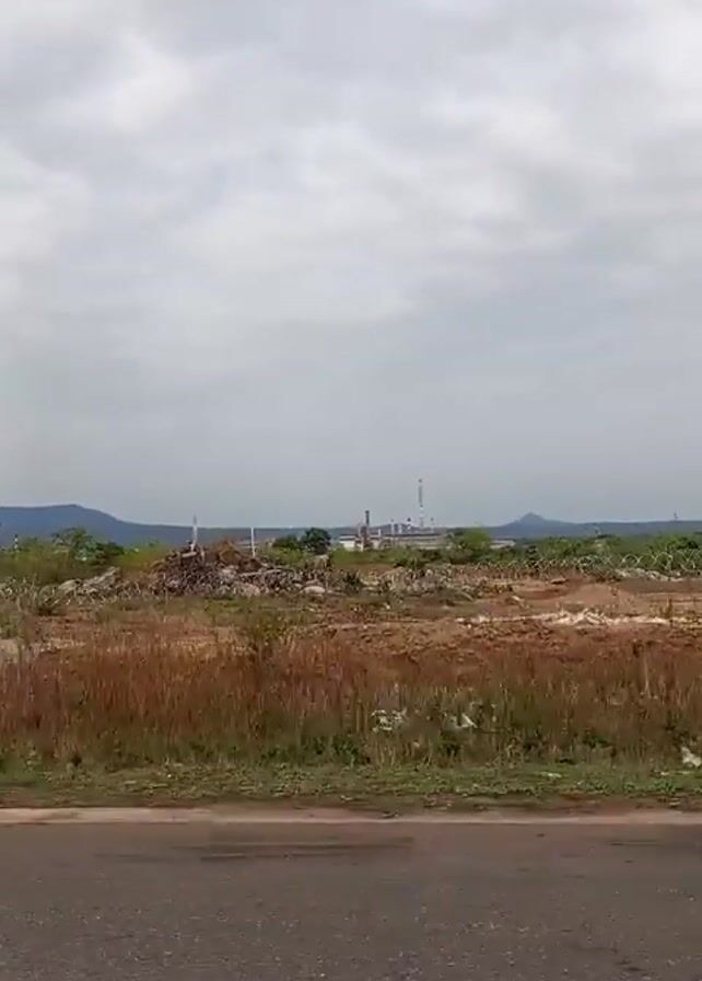 n outdoor scene. The camera appears to be moving along a road, as evidenced by the asphalt passing by. Across the road, there's a field with dry grass and some vegetation. In the distance, there's a factory or industrial complex with tall structures. The sky is overcast with gray clouds. At one point, a silver car passes by on the road. There are also trees and bushes visible along the edge of the road and in the field. Additionally, mountains are visible on the horizon.