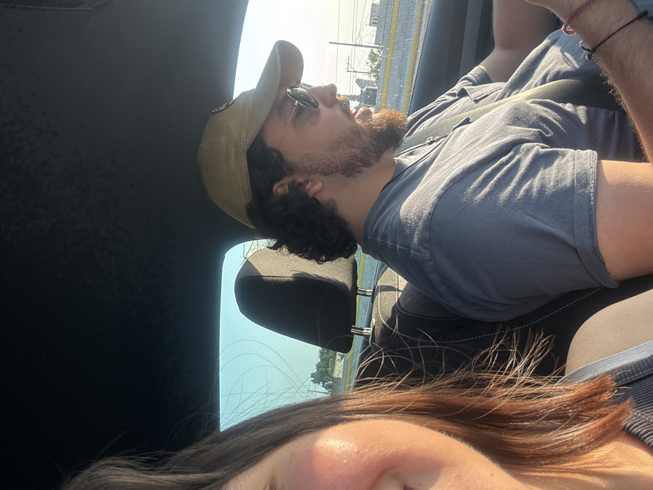 The image depicts the interior of a moving vehicle during daylight in Cuautla, Mexico. In the foreground, the left side of a female individual's face, neck, and shoulder are visible. She has dark, medium-length hair and fair skin, with a slight smile on her lips. She wears a dark, ribbed garment. To her right, seated in the driver's seat, is a male individual presented in profile, looking forward. He wears a tan baseball cap with an emblem, dark sunglasses with thin frames, and a faded grey short-sleeved t-shirt. He has dark, curly hair visible beneath his cap and a full reddish-brown beard. A seatbelt is fastened across his chest. A silver pendant hangs from a chain around his neck, and several bracelets are visible on his left wrist. His mouth is slightly ajar. Through the vehicle's windows, a bright, light blue sky is visible. Below the sky, green foliage, indistinct urban structures, utility poles, and electrical wires are discernible. A concrete barrier, possibly part of a bridge or highway, is also visible in the mid-distance. The scene is strongly illuminated by sunlight from the right side of the frame.