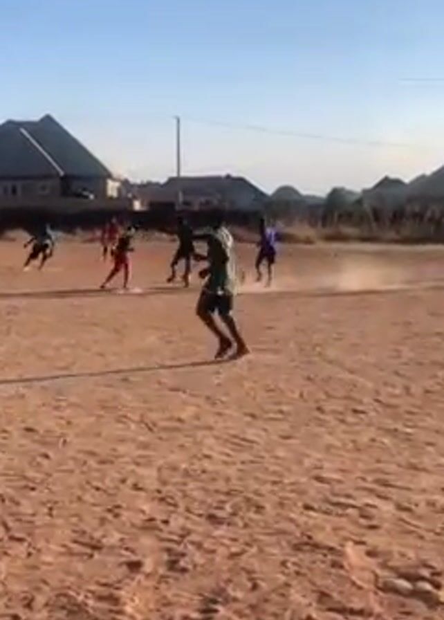 group of young men playing soccer on a dusty, reddish-brown field under a clear, bright blue sky