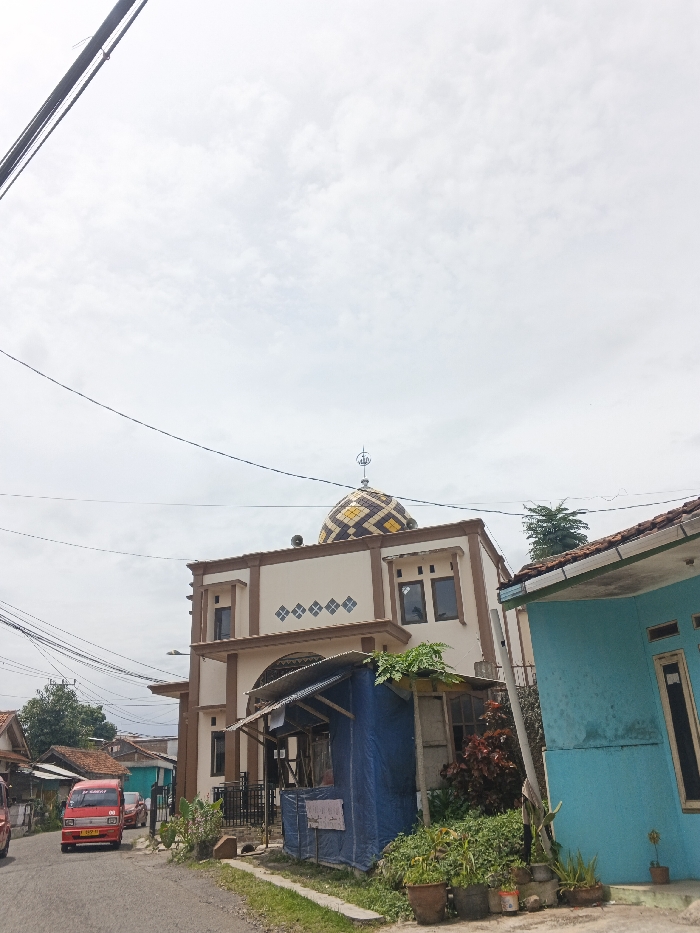 A two-story building with a tiled dome stands in a neighborhood. It is beige with brown trim and a diamond pattern along the roofline. A small blue structure sits near the entrance. A light blue house is on the right. Utility poles and wires are visible in the sky, which is cloudy. A red van drives down the street on the left. Potted plants and greenery surround the buildings.