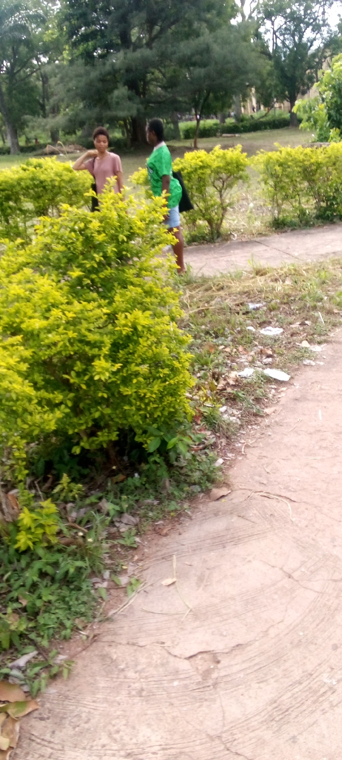 two young women standing on a paved path in a park in Okigwe, Nigeria