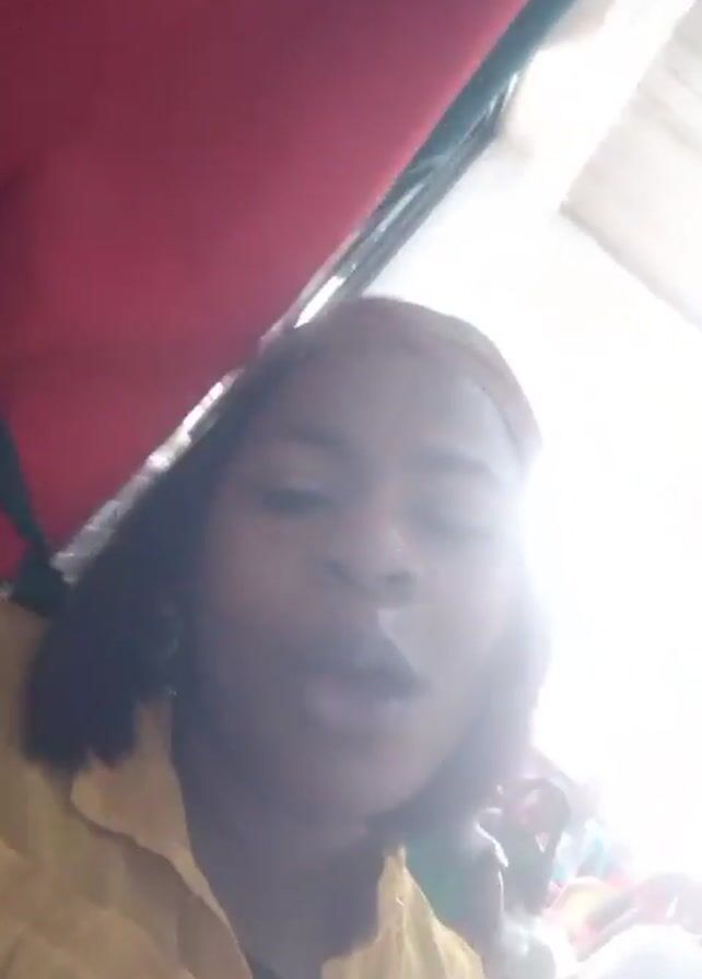 A woman is recording a selfie video. She is wearing a light brown shirt and a headscarf. Her hair is dark. She has a nose ring. The background is a red and green cloth. She is singing or speaking. The video is somewhat overexposed. The camera used is a Tecno Spark 9T.