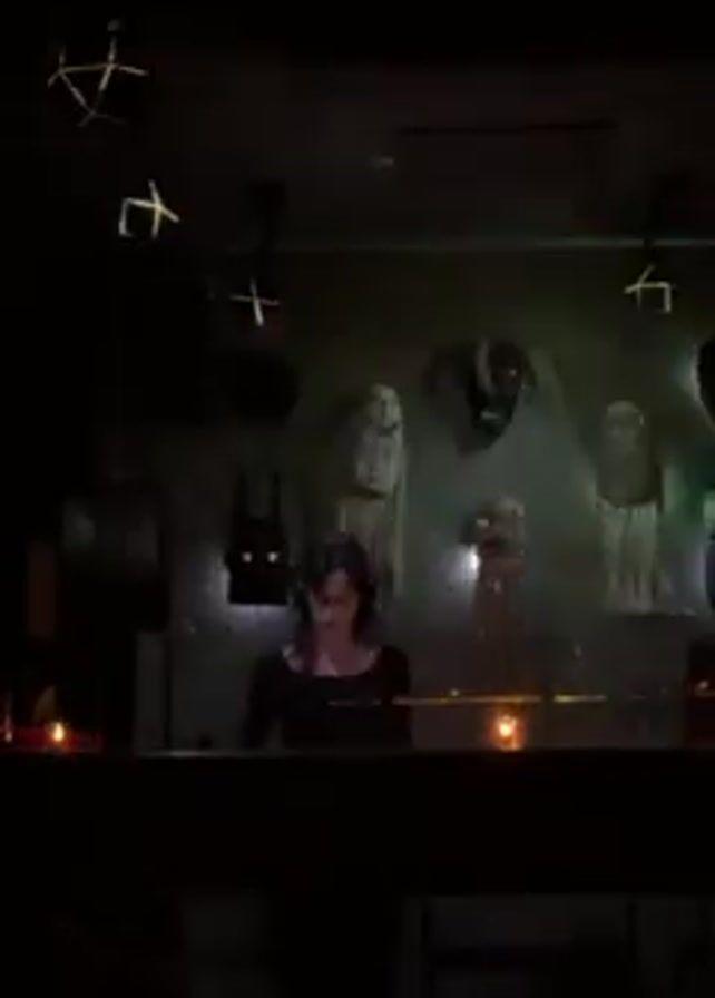 DJ in a dimly lit room. The DJ, a woman with dark hair wearing headphones, is standing behind a table. Behind her is a wall decorated with several masks. There are geometric light fixtures hanging from the ceiling and candles flickering on the table in front of the DJ. The room has a dark and slightly eerie atmosphere. She appears to be working, presumably mixing or playing music.