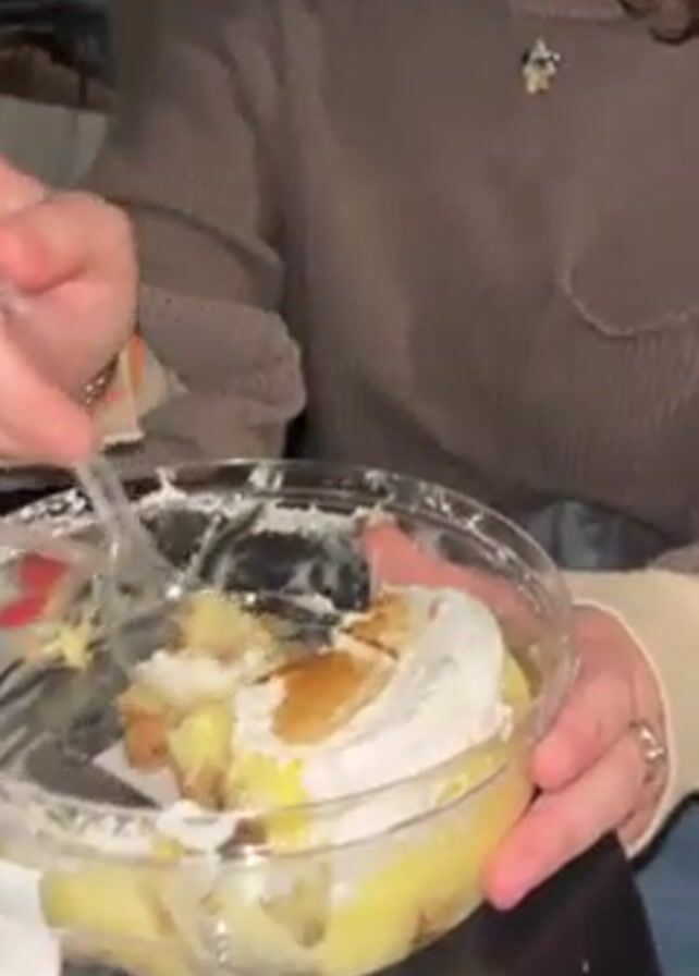 A woman is shown eating from a small, transparent container filled with a dessert