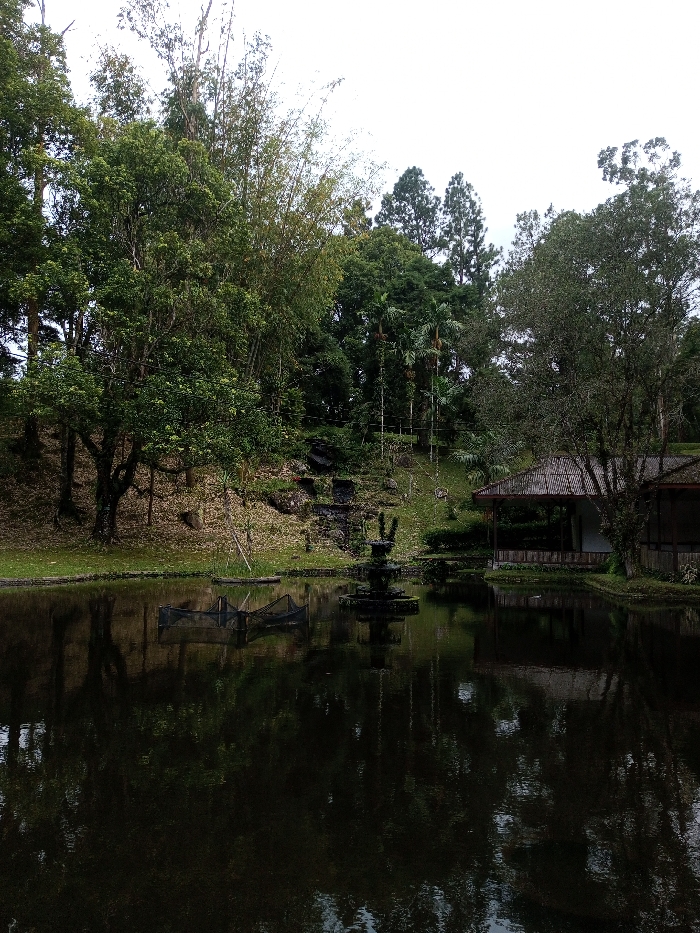 An outdoor scene in Ambositra, Madagascar, depicts a tranquil pond reflecting dense surrounding vegetation under an overcast sky. The foreground features the dark, calm water of the pond. To the left in the water, a dark, cage-like structure, possibly a fish trap, is partially submerged. Centrally located in the pond is a dark, multi-tiered stone fountain, appearing inactive. The pond's left bank shows a grassy slope leading up to a rocky area with a small, multi-tiered waterfall flowing into the pond. Lush green trees, including some with slender trunks and light green foliage, densely populate this slope and beyond. The ground under these trees is covered with grass and sparse leaf litter. On the right side of the pond, a building with a dark, sloped, tiled roof is partially visible behind trees. The building features light-colored walls and an open porch or veranda. The background is dominated by a dense forest on a hill, comprising various tall trees, including bamboo, conifers, and broadleaf species, extending upwards towards a uniformly white, overcast sky. No people, discernible actions, or interactions are visible.