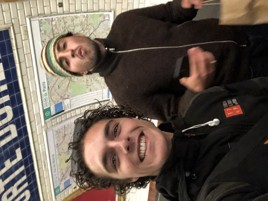 Two adult males are depicted in a selfie-style photograph taken within what appears to be the Porte de Charenton Métro station in or bordering Charenton-le-Pont, France