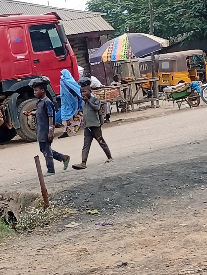The image depicts a street scene in Zaria, Nigeria, characterized by pedestrian and vehicle activity alongside informal commerce. In the foreground, two young boys walk across a paved road, moving from right to left. The boy on the left wears a dark blue shirt and pants with green sandals, carrying a black object on his head. The boy on the right wears a greenish-grey shirt and dark pants with dark sandals, also carrying a black object on his head, with his right hand near his mouth. Behind the left boy, a woman in a light blue head covering and patterned attire walks near a large red HOWO semi-truck, which is either stationary or moving slowly on the left side of the road. To the right of the truck, further back, street vendor stalls operate under a multi-colored umbrella. These stalls display various items, possibly food. A person is visible seated behind one of these stalls. Parked behind the stalls is a yellow Keke Napep (auto-rickshaw) and another partially visible yellow tricycle. A green wheelbarrow rests on the dirt shoulder of the road to the far right, with part of a bicycle wheel visible beside it. The immediate foreground features a dirt and gravel shoulder with sparse vegetation, including small white flowers, and a rusted metal pole protruding from the ground on the left. The ground shows evidence of dust and scattered debris. Buildings with corrugated metal roofs are visible in the background, along with green foliage from trees. The sky is overcast.