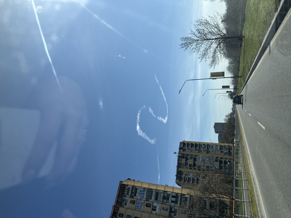 The scene depicts a multi-lane asphalt road under a clear blue sky in Pazardzhik, Bulgaria, specifically along Bulgaria Boulevard (бул. България), likely looking westbound. The image is captured from inside a vehicle, evidenced by subtle reflections on the windshield. On the left side of the road, a metal safety barrier separates the carriageway from a sidewalk and a row of large, multi-story residential apartment buildings. The foreground building on the left is a tall, yellowish block with numerous windows and balconies, featuring a distinctive dark roof and arched windows on its upper floors. Another similar building is visible further down the road behind it. Bare deciduous trees are present between the barrier and the buildings. The road features clear white lane markings, with at least two lanes visible in the direction of travel. A dark-colored car, possibly an SUV, is observed in the distance in the rightmost lane, proceeding in the same direction. On the right side of the road, a wide grassy median or park-like area extends, populated with several bare deciduous trees. A series of black streetlights are spaced along this side, each bearing a green and yellow banner, one of which prominently displays the text "efbet." The sky is bright blue and mostly clear, with the sun visible in the upper right quadrant, causing a lens flare effect. A prominent, wavy white contrail, resembling a stretched "N" or "M" shape, is visible in the mid-sky. Another faint, straight contrail streaks across the upper right corner. The presence of bare trees and green grass suggests early spring or late autumn. No individuals are explicitly identifiable.