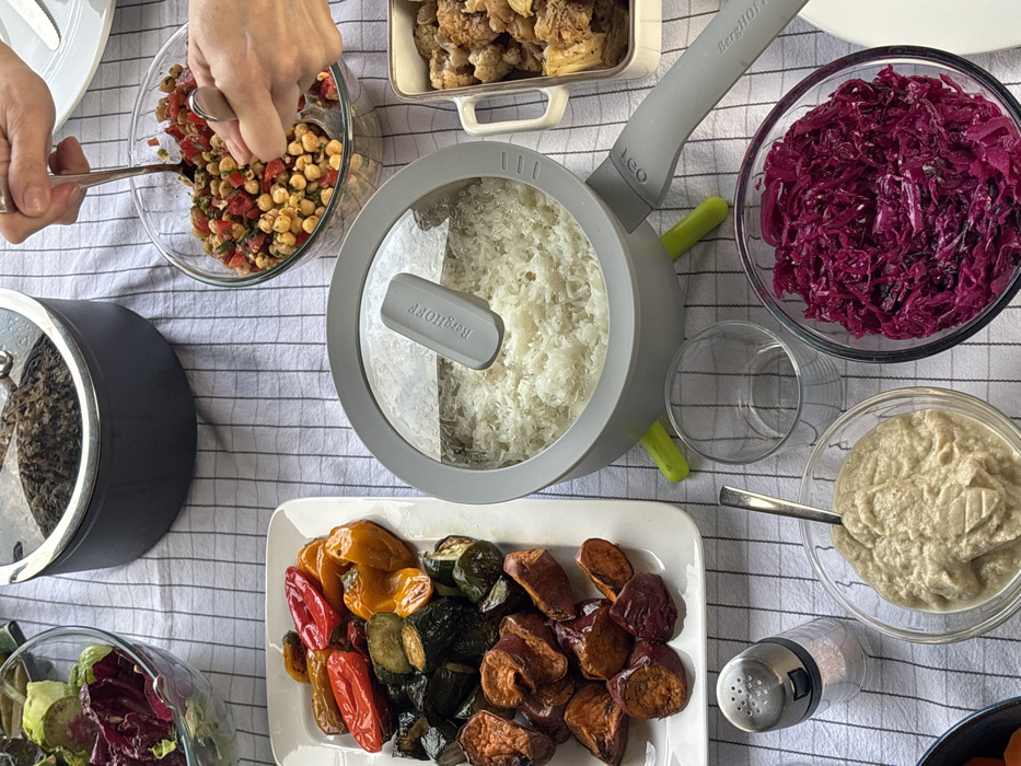 The image depicts an overhead view of a dining table in Ramat HaSharon, Israel, laden with various food dishes. The table is covered with a white tablecloth featuring a thin black grid pattern. In the upper left, a clear glass bowl holds a green salad with red leafy greens. Adjacent to it, a dark gray pot with a clear lid contains a dark, granular food item, possibly a lentil or rice dish. In the upper right, a pair of adult hands are visible, one holding a serving spoon and the other a fork, actively scooping a chickpea salad with diced tomatoes and herbs from a clear glass bowl. Centered on the left is a white rectangular platter displaying roasted vegetables, including red, orange, and yellow bell peppers, zucchini slices, and sweet potato chunks. Directly to its right, a light gray BergHOFF Leo pot with a clear lid, marked with "BergHOFF" on its handle, contains cooked white rice and rests on three bright green, tripod-like supports. To the right of the rice pot, a white rectangular baking dish holds roasted cauliflower or similar vegetables. In the lower left quadrant, a silver-colored salt shaker with a clear base containing pink salt stands next to a clear glass bowl holding a light-colored, creamy dip, with a spoon immersed within it. An empty clear drinking glass is positioned next to the rice pot. In the lower right, a clear glass bowl is filled with shredded red cabbage.