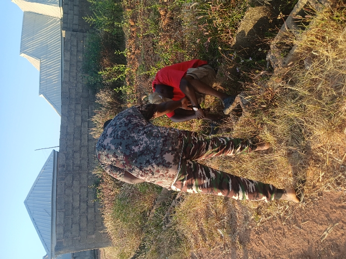 The scene depicts an outdoor interaction between two adult males in Bahit, Nigeria. The environment features dry, reddish-brown soil, sparse dry grass, and low vegetation. In the background, a concrete block wall separates the foreground from several buildings with light-colored corrugated metal roofs under a clear blue sky. One male stands with his back mostly to the viewer, leaning forward and downwards. He is dressed in a digital camouflage pattern t-shirt and matching camouflage pattern trousers. His head is obscured by his posture. He wears open-toed footwear. The second male is seated on the ground or a low embankment to the right of the standing individual. He wears a red short-sleeved t-shirt and light-colored shorts, with dark closed-toe footwear. His head is bowed, facing downwards, and his hands are clasped or interlocked near his knees. A narrow, concrete-lined drainage ditch is visible immediately in front of the seated man. The standing individual is positioned directly in front of the seated person, suggesting an active interaction or observation of the seated individual, whose posture implies submission, distress, or rest. The scene is illuminated by bright daylight.