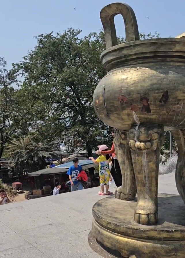 The video depicts a scene at a temple or religious site, with various elements of Eastern culture. It starts with a view of a pathway with people and trees, then pans to a large, ornate bronze incense burner. The video then shows stairs with decorative railings that lead to a massive white statue of Buddha in a meditative pose. People are walking up and down the stairs, and some are taking pictures. The weather appears to be sunny and the sky is clear.