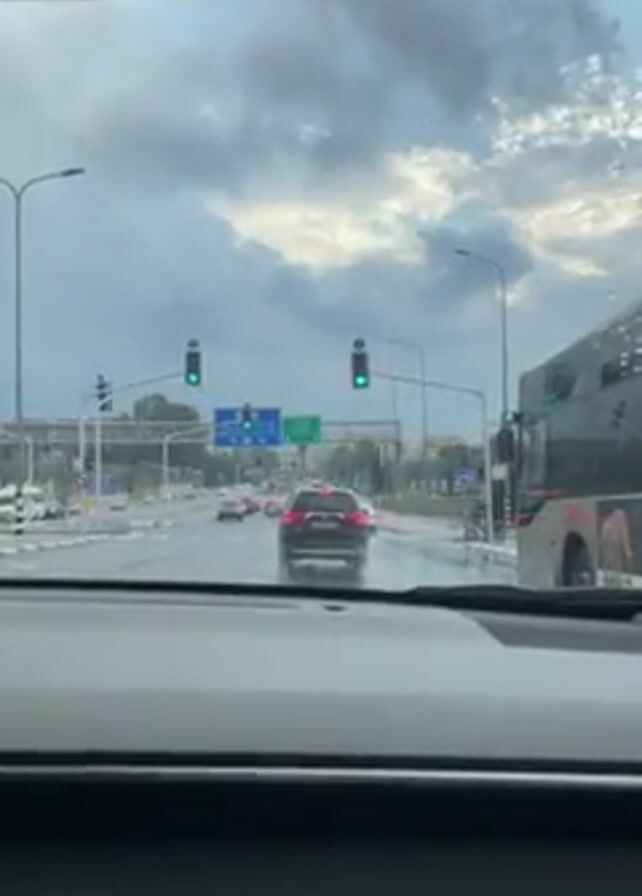 From the perspective of a driver inside a car, the video shows a rainy road with multiple vehicles