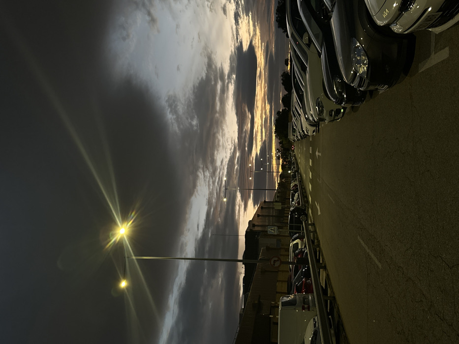 The image displays an outdoor parking area or access road located in Base Aérea, Spain, at dusk. The sky is heavily clouded with dark gray formations, interspersed with a horizontal band of orange, yellow, and pale blue light along the right horizon, indicative of a sunset. The scene is primarily illuminated by artificial lighting. A prominent, tall, gray metal streetlight pole is positioned in the left foreground, supporting two bright, yellow-white lamps that emit distinct lens flares. Additional streetlights extend into the background along the road. An asphalt roadway, marked with faded white lines including a solid line on the left, a dashed center line, and two forward-pointing arrow symbols on the right lane, recedes into the distance. On the left side of the road, a silver metal guardrail separates the thoroughfare from a row of parked vehicles. These include a white utility van in the immediate foreground, followed by several passenger cars. Behind these vehicles, a long, dark, multi-story building structure with an elevated section is visible. A circular "no left turn" traffic sign and a triangular pedestrian crossing sign are mounted near the guardrail on the left. On the right side of the roadway, numerous passenger vehicles, including sedans and hatchbacks in colors such as white, black, and gray, are parked in a parallel configuration, extending into the background. No individuals are present in the depicted scene. Trees are visible in the distance on the far right, silhouetted against the horizon.