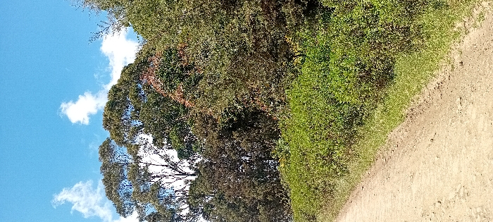 This image depicts a rural outdoor scene in Heni Village, Kenya. The foreground and lower-left feature an unpaved, light brown dirt path, suggesting a trail or roadway. This path is bordered on its right by a strip of sparse green grass, transitioning into a dense line of vibrant green bushes and shrubs. Beyond the bushes, a diverse collection of trees forms the background and midground. These include tall trees with dense green foliage, some exhibiting darker leaves, while others show lighter green and reddish-brown hues. The upper portion of the image is dominated by a clear blue sky, interspersed with a few scattered white cumulus clouds. No people, animals, man-made structures (other than the path), or specific actions are visible within the frame.