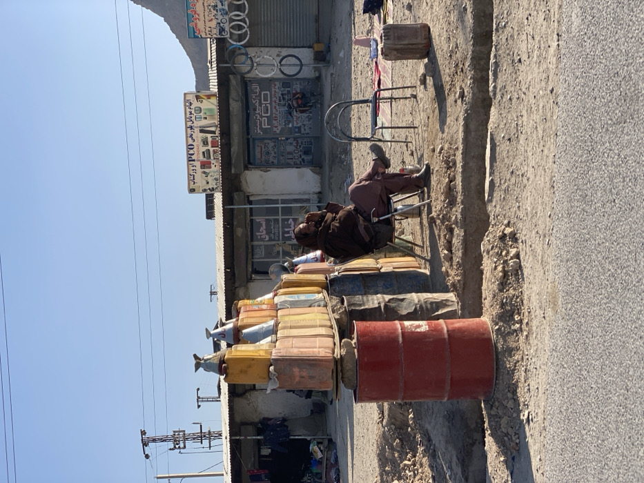 The image displays a street scene in کوکران, Afghanistan, under a clear, bright blue sky. In the foreground, a makeshift fuel station is evident, constructed from two stacked red metal drums serving as a base, topped with a wooden board supporting numerous multi-colored plastic jerry cans. Several metal funnels are positioned on the tops of some jerry cans. To the right, one adult male is seated on a light-colored folding chair, his right leg crossed over his left, with his right hand near his face. He wears dark brown outer clothing and light brown trousers. A silver thermos is visible at his feet. An empty dark-colored metal chair stands adjacent to him, with a brown plastic jerry can and a colorful mat placed on the dusty ground nearby. The background features a row of single-story commercial buildings with corrugated metal roofs. The central building exhibits a large sign advertising "PCO" and mobile phones/electronics in a non-Latin script, while bicycle tires are vertically displayed on the exterior of the adjacent shop to its right. Utility poles and power lines are visible against the sky. A barren mountain range rises in the far background on the right. The ground transitions from a paved road in the immediate foreground to uneven, dirt, and gravel surfaces with shallow trenches leading up to the buildings.