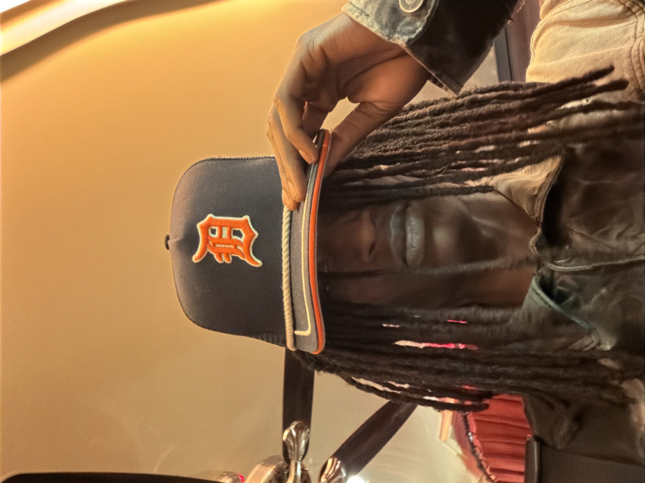 A person with dreadlocks is tipping a Detroit Tigers baseball cap. The cap is navy blue with an orange "D" logo. The person is wearing a denim jacket. The background appears to be an indoor setting with warm lighting and reflective surfaces.