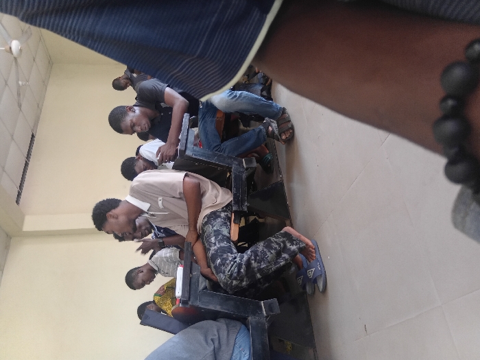 A group of students sits in desks arranged in rows in a brightly lit classroom with beige walls. Most students are looking down at something in front of them, possibly writing or reading. The students are wearing various casual outfits, including shirts of black, white, and tan, along with pants and jeans. A person's arm with a beaded bracelet is visible in the foreground.