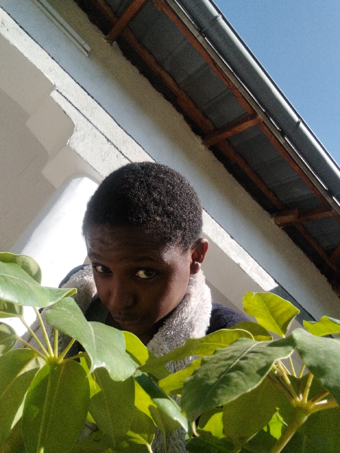 A person with dark skin and short, dark hair is partially visible behind a bush with glossy, green leaves. The person wears a dark top and a fuzzy, light-colored jacket or shawl. The background shows a white building with a dark-colored roof and wooden supports, set against a bright blue sky. The photo is taken from a low angle, looking up at the person.