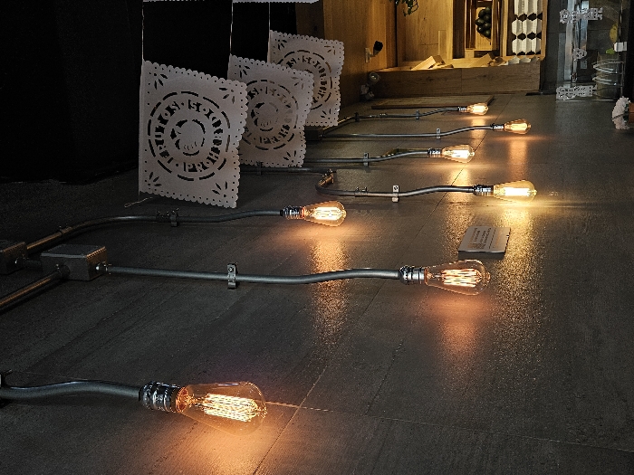 The image displays the interior of a commercial establishment, inferred to be a restaurant or bar located in Mexico City, Mexico. No people are present in the scene. The left two-thirds of the frame feature a dark, textured wall, appearing to be made of stone or concrete. Exposed electrical conduits, constructed from gray metallic piping, are affixed to this wall and the ceiling. These conduits serve as mounts for multiple vintage-style Edison light bulbs, which hang at varying lengths and illuminate with a warm, amber glow, casting reflections on the wall surface. Each bulb features a visible filament. A small, light-colored rectangular plaque is mounted on the wall to the left of the central bulbs. In the upper right portion of the image, several white, rectangular *papel picado* banners are strung. Each banner showcases intricate laser-cut designs, including a central circular motif with a stylized face or skull and surrounding patterns. A dark security camera is visible mounted on a beam above these banners. The lower right section reveals a service area. A wooden shelving unit holds several green avocados in a container and a stack of white, rectangular dishes or containers. Below this, a clear glass counter or barrier displays various empty clear glasses and a small white floral arrangement in a vase. The environment is dimly lit, with the Edison bulbs providing the primary light source.