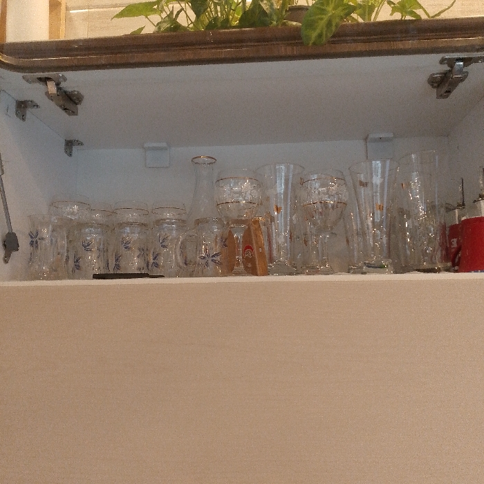This image depicts the interior of an open wall-mounted cabinet, likely within a domestic setting in Baghdad, Iraq. The cabinet door is in an upward, open position, supported by metallic hinges and a gas strut mechanism visible on the left side of the frame. Inside, on a white shelf, a collection of clear glass drinking vessels is arranged. These include approximately eight glass mugs featuring a blue floral design, several clear glass goblets with gold rims and textured patterns, various tall clear glass tumblers or vases, and a single clear glass carafe with a gold rim. A small, light brown, rectangular object is positioned upright amidst the glasses. On the far right, a portion of a red object, possibly a small container or dispenser, is visible. Above the open cabinet, a dark brown wooden trim is present, and green foliage from a plant can be seen. The lower section of the image displays a plain, light beige wall or cabinet exterior. No individuals are present in the scene, and no active interactions are depicted.