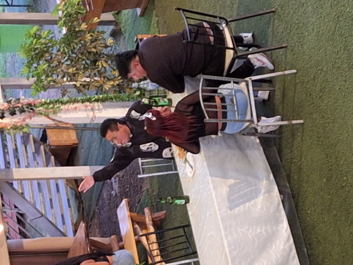 The scene is outdoors, likely at a restaurant or bar. The location is Socabaya, Peru, based on the provided coordinates. Three individuals are seated around a table with white tablecloth. The person on the left, wearing a black shirt with white skull print, is gesturing with their right hand toward the table. The person in the center, wearing a black shirt, is seated with their left hand on the table, and their right hand appears to be holding a cell phone. The person on the right is seated wearing a blue jeans and a black shirt. They have their left hand on the table and their right hand on their lap. There are empty bottles and a plate of food on the table. A green plant is visible in the background. The ground is artificial grass. The scene suggests a casual, relaxed atmosphere.