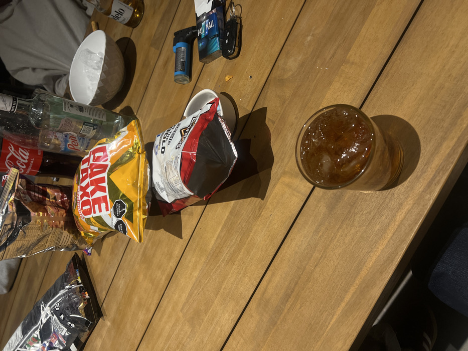 The image captures a wooden table littered with remnants of a gathering. A glass of iced beverage sits beside open bags of potato chips ("Takis" and "Sabritas"), an empty Coca-Cola bottle, and various liquor bottles. A white bowl and a lighter are also visible, along with a pack of cigarettes and car keys. The overall impression is of a casual, social event with snacks and drinks scattered about.