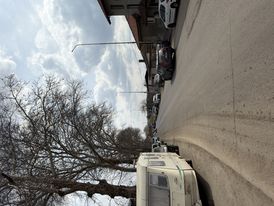 The image displays a street scene in Popovo, Bulgaria, under a partially cloudy sky. A two-lane asphalt road, showing signs of wear and dirt, extends from the foreground into the distance. On the left side of the road, a wide dirt shoulder is present. A cream-colored recreational vehicle (RV) or caravan with a green accent stripe and multiple windows is prominently parked on this shoulder in the foreground. Behind it, a row of additional cars, including a dark-colored SUV, are parked bumper-to-bumper. A line of tall, bare deciduous trees with thick, gnarled trunks frames the left side of the scene, indicating a dormant season. On the right side of the road, several buildings are visible. The closest structure is a two-story building with light-colored walls and a terracotta tiled roof, featuring a small protruding covered entrance. Further down the street, more residential or commercial buildings with similar roof styles are present. Several vehicles, including a white two-door hatchback, are parked parallel to the curb on this side. A dark grey station wagon with a Bulgarian license plate (partially visible, 'T 1519...') is positioned on the right lane of the road, actively moving away from the viewer. Further down the road, additional vehicles are visible in both directions, including what appears to be a light blue truck on the left in the far distance. Multiple streetlights with single luminaires are spaced along both sides of the road, with overhead utility lines visible connecting poles and buildings. No people are visible in the scene.