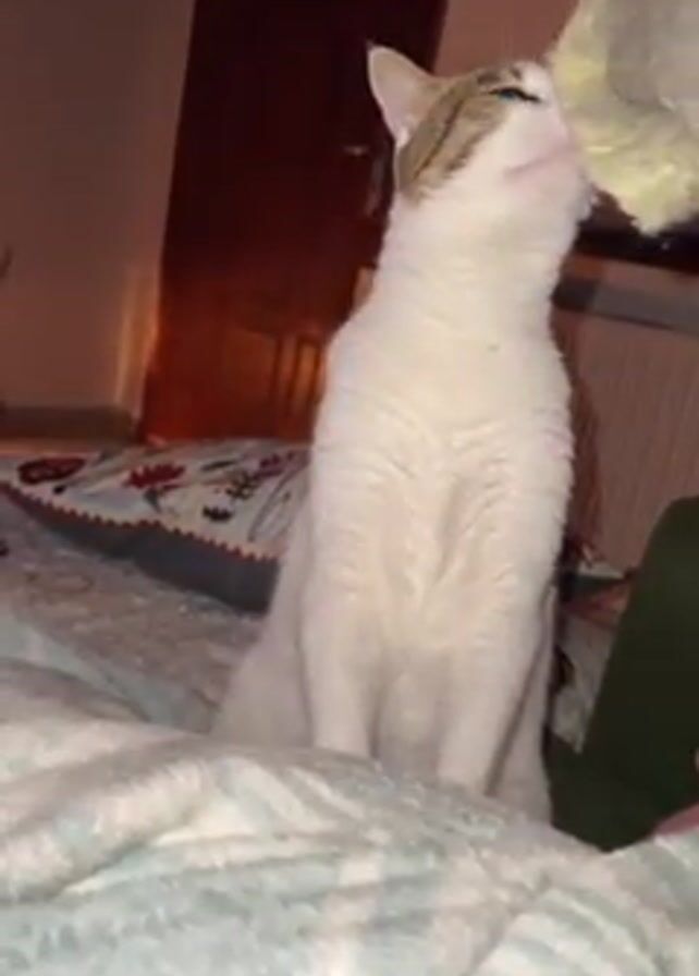 A white cat with a brown head patch and green eyes sits on a bed. A person holds a fuzzy, light-colored toy in front of the cat. The cat reaches up and grabs the toy, then rolls on its back with the toy. The bed has a patterned pillow and a light blue patterned blanket. A dark wooden door is visible in the background.