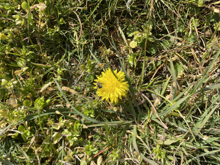 The image displays a close-up, overhead view of a natural outdoor environment located in Bulgarovo, Bulgaria. A single, fully bloomed yellow flower, consistent with a dandelion, is positioned slightly above the center of the frame. A small, dark-bodied insect, resembling a bee or hoverfly, rests on the petals of this yellow flower, oriented with its head facing towards the upper-left portion of the image. The ground is densely covered with a variety of green vegetation, primarily comprising grass blades and several types of small, broad-leafed plants. The scene is illuminated by natural sunlight, indicating a daytime setting. No human subjects or man-made objects are present.