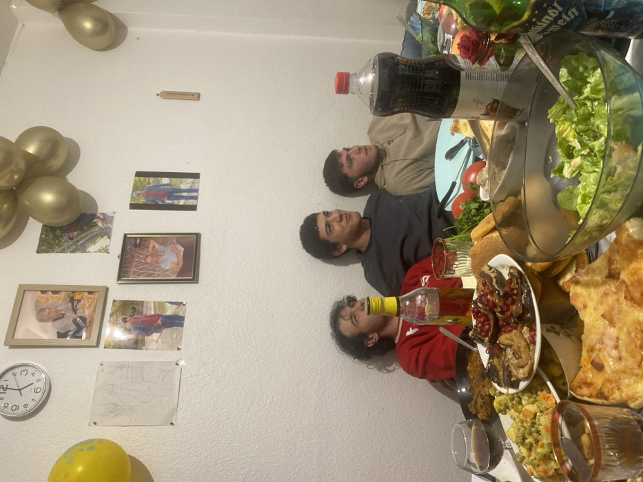 The image captures an indoor celebratory meal within a private residence in Strasbourg, France. Three young men are seated side-by-side at a dining table, their torsos visible against a white, textured wall. The leftmost man has dark, curly hair and wears a red long-sleeved shirt, looking towards the left. The middle man, with short dark hair, wears a dark gray long-sleeved shirt and smiles while looking right. The rightmost man, also with short dark hair, wears a light brown hooded sweatshirt and looks towards the right. The wall behind them is adorned with a round wall clock displaying approximately 12:45, and a cluster of golden balloons in the upper right corner, with a single yellow balloon in the upper left. Multiple photographs and a sketch are affixed to the wall: a framed portrait of an older man, unframed prints of a young man in a baseball cap, a framed picture of an older woman, and an outdoor scene. A wooden ornament or thermometer hangs on the right side of the wall. The table in the foreground is heavily laden with a diverse array of dishes and beverages. Visible items include a clear glass of dark liquid, a salad with peas, a plate of baked eggplant topped with pomegranate seeds, slices of pizza, various types of bread, and a large glass bowl of green leaf lettuce. Beverages include a large plastic bottle of dark soda and a green glass bottle with a partially visible label containing the word "Wein," suggesting wine, aligning with the cultural context of the Alsatian region. A bottle of yellow liquid, likely oil, is also present. The scene indicates an abundant festive gathering.