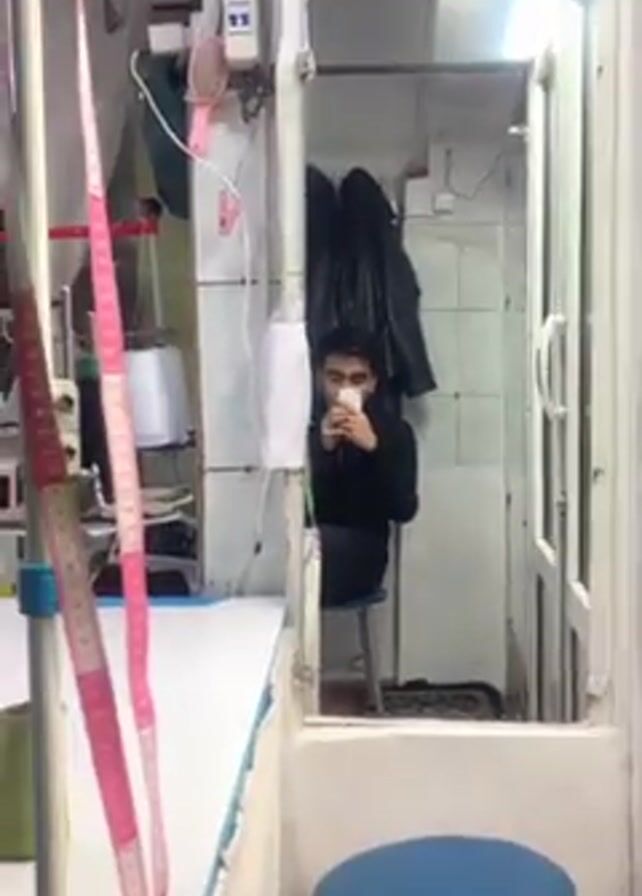 man taking a selfie in a mirror inside what appears to be a small tailoring or sewing workshop