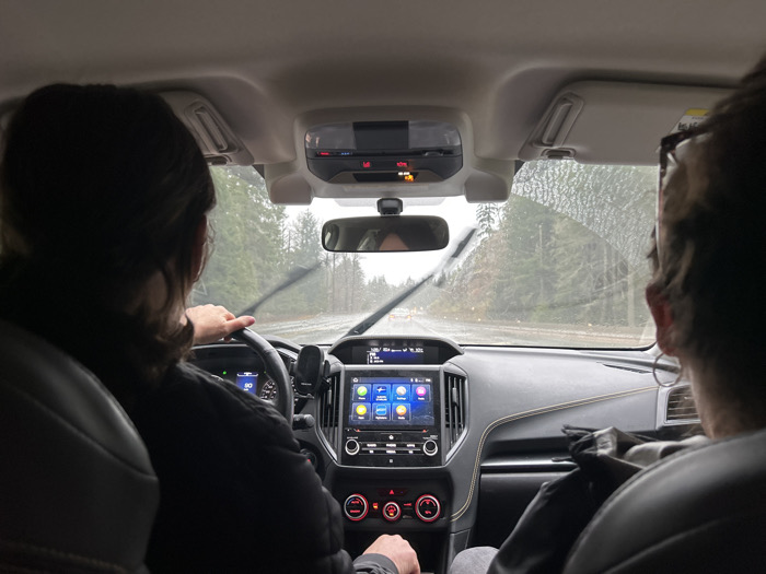 From inside a car, a driver is seen steering while windshield wipers clear the rain. A passenger sits beside the driver. Outside, trees line a wet road under an overcast sky. The dashboard is visible with a touchscreen display and climate controls. An interior mirror and overhead console are also in view. The road ahead appears slick and potentially hazardous.