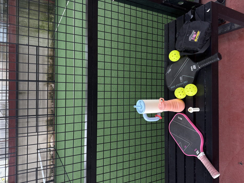 An aerial perspective displays a black bench adjacent to a green pickleball court. On the bench, a black bag, two pickleball paddles (one black, one pink), four yellow pickleballs, and a two-toned pink and light blue water bottle are neatly arranged. The background consists of a fenced court with visible greenery. The color scheme is dominated by green, black, yellow, and pink.
