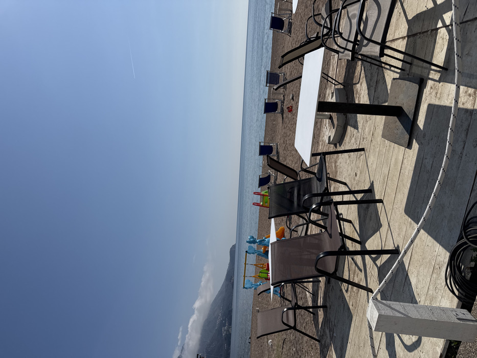 - "The image displays an unoccupied outdoor seating area situated on a wooden deck adjacent to a pebble beach in Boreti, Montenegro" by FM-JSAz93, licensed under CC BY 4.0
