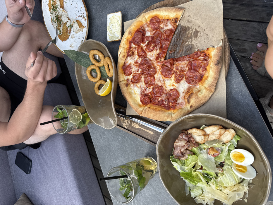 The scene depicts an outdoor dining area in the city of Unknown, Ukraine, viewed from a high angle. A dark grey table is centrally featured, laden with food and beverages. One individual, an adult male, is visible from the mid-thigh up, seated on a grey upholstered sofa. He wears black shorts, and his right hand holds a fork and knife, positioned over a white plate containing a partially consumed dish topped with a white sauce. A black smartphone rests on the sofa behind his left thigh. A silver-colored bracelet is on his right wrist. The feet of a second individual, likely an adult female, are visible at the bottom right, with light purple painted toenails, resting on a wooden plank floor. The table holds a large pepperoni pizza on a round wooden board, with one slice removed. Adjacent to it is an irregularly shaped bowl containing a Caesar salad with lettuce, Parmesan cheese, chicken strips, bacon, and two hard-boiled egg halves. A boat-shaped dish contains five golden-brown fried rings, garnished with a lemon wedge and a green leaf. A small rectangular white dish holds a creamy white dip. Two tall glasses, each with a black straw, contain clear beverages with lime slices and mint leaves. A wooden utensil holder, etched with "3X RESTAURANT" and "KIEV AXIOM," holds a metal fork and knife. The setting indicates a relaxed meal, with the male individual actively engaged in eating.