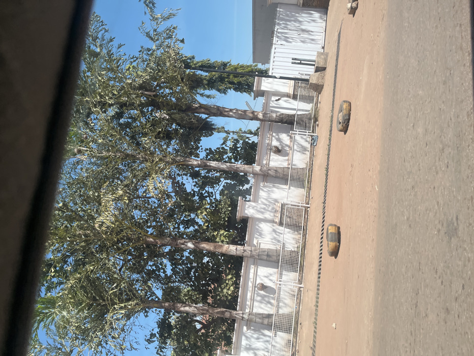 This image depicts an outdoor scene in Mangu Town, Nigeria, under clear blue skies, likely observed from inside a vehicle due to dark linear obstructions at the top and bottom. The foreground consists of reddish-brown earth. Two worn tires, partially painted yellow, lie horizontally on the ground. A black linear grate, consistent with a drainage system, is embedded in the dirt between the tires and a fence. The mid-ground features a low, white grid-pattern metal fence running horizontally. Behind this fence stands a tall, white perimeter wall with decorative pilasters. Four prominent, tall trees with light-colored trunks and dense green foliage are positioned in front of and partially obscuring the white wall. Denser green vegetation is visible above and behind the wall. To the far right, a white metal gate is partially visible next to the wall, and a tall, slender pole or tree with clinging vines stands nearby. No people or active interactions are visible in the scene.