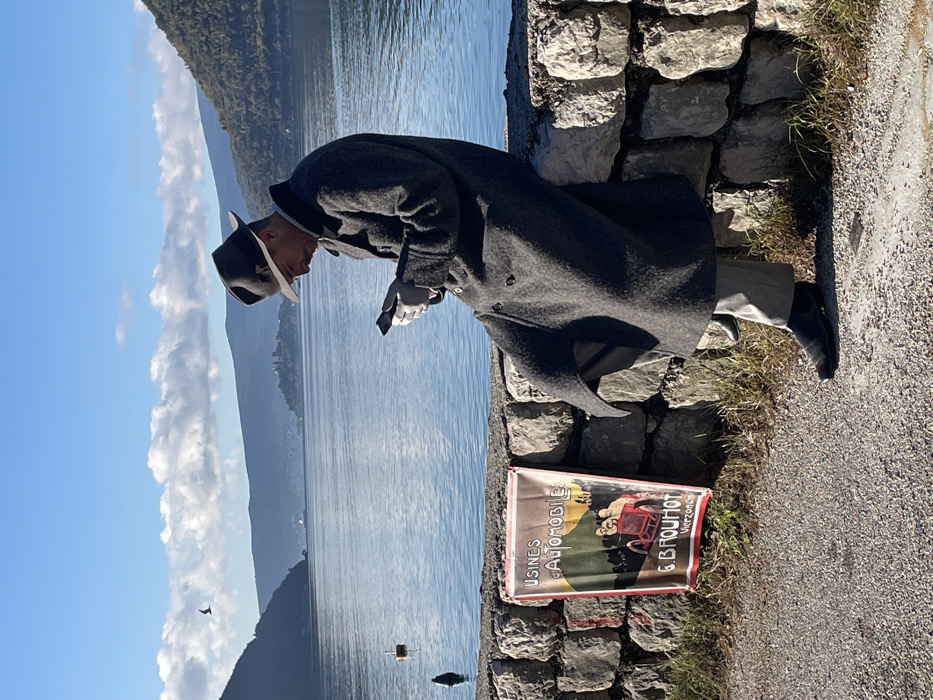An elderly man in a dark coat and fedora stands by a stone wall overlooking a lake. He appears to be reading or examining something in his hands. Behind him, a vintage advertisement sign for "Usines d'Automobiles G.B. Prouhot Vierzones" rests against the wall. The background includes a clear sky with mountains and clouds across the lake. A few boats or floating objects are visible in the water. The photo is taken in daylight.