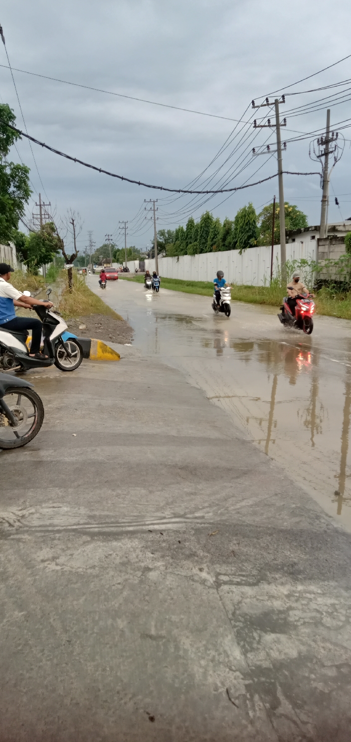 The image depicts a partially flooded concrete road in Sumput, Indonesia, under an overcast sky