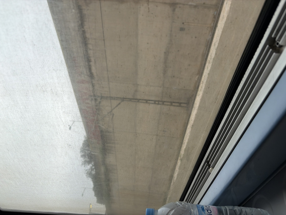 An angled view of a concrete overpass seen through a dirty window. A bottle of water sits in the bottom right corner in front of the window’s air vent. Visible through the grimy window is a grey concrete bridge structure. There is some vegetation visible beneath the bridge, obscured by dirt on the glass.