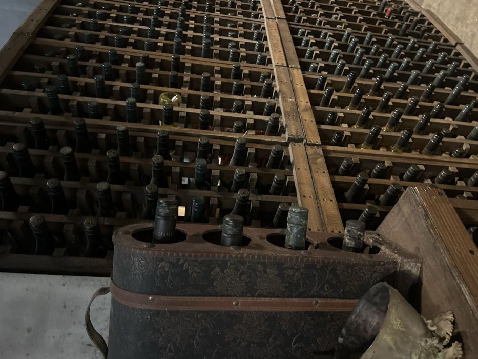 The scene depicts an interior view of a wine cellar or storage room in Unknown, Unknown